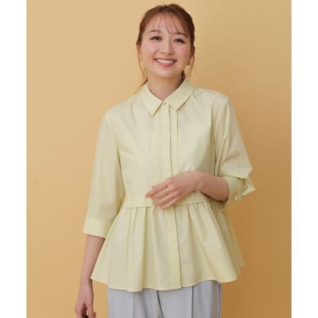 ・1枚でしっかり着映えし、羽織りとしても使えるシャツ・少し短めな丈感と腰位置を高く見せるペプラムデザイン・シャツ襟×甘めディテールでトレンド感抜群・オフィスでも着られるきちんと感を残したデザイン・パール調ボタンが上品で可愛いポイント・さり気なく後ろ下がりがついたデザイン・長い時期着られる袖丈