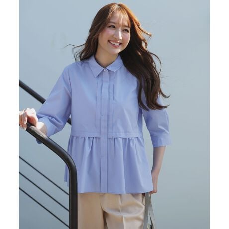 ・1枚でしっかり着映えし、羽織りとしても使えるシャツ・少し短めな丈感と腰位置を高く見せるペプラムデザイン・シャツ襟×甘めディテールでトレンド感抜群・オフィスでも着られるきちんと感を残したデザイン・パール調ボタンが上品で可愛いポイント・さり気なく後ろ下がりがついたデザイン・長い時期着られる袖丈