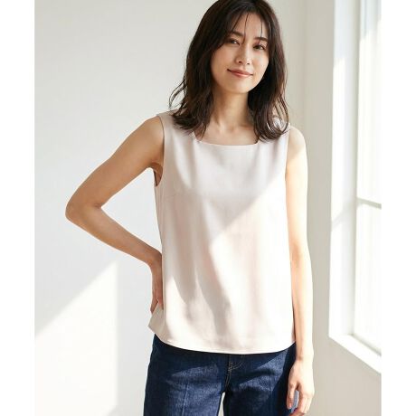 ・前後どちらでも着られる2WAYデザインで、着回し力に優れた異素材ドッキングタンク・前身頃はサテンと天竺を重ねた2枚仕立てで、上品な光沢と安心感のある透けにくさを両立・裾は前後とも柔らかなカーブラインで、身体のラインを拾わず自然に細見え・インでもアウトでもバランスよく決まる・デコルテを美しく見せ、一枚でも安心して着用可能