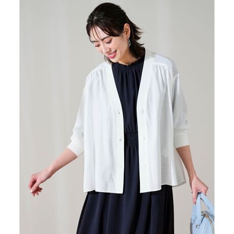 ワンピースや、トップスの上にさっと羽織れるアイテム。ノースリーブの上に前を閉じて着用した、ブラウスライクな着こなしも素敵に決まります。