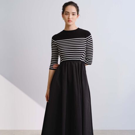 トップス部分はニットのリブ編みで着心地の良さとフィット感のある仕上げり。ボトムス部分はハリのあるタフタ素材でボディラインも出にくくメリハリのあるシルエットにしています。長めのスカート丈で今っぽさを出しつつ、1枚でサクッとスタイリングが完成する便利アイテム。