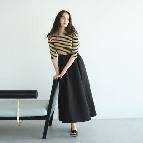 トップス部分はニットのリブ編みで着心地の良さとフィット感のある仕上げり。ボトムス部分はハリのあるタフタ素材でボディラインも出にくくメリハリのあるシルエットにしています。長めのスカート丈で今っぽさを出しつつ、1枚でサクッとスタイリングが完成する便利アイテム。