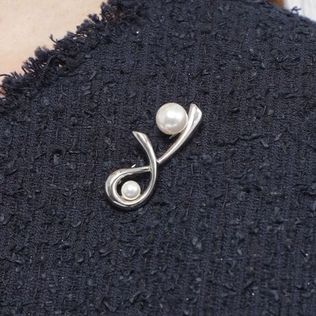 [型番:K1V22711__]<襟元を上品に彩るエレガントブローチ>柔らかいメタルラインが上品なブローチです。ガラスパールを配し、シンプルながらもエレガントなデザインに仕上げました。程良いサイズ感でさりげなく襟元に華やかさを加える一品です。ビジネスからオケージョン、デイリーカジュアルまで幅広いシーンで活躍します。