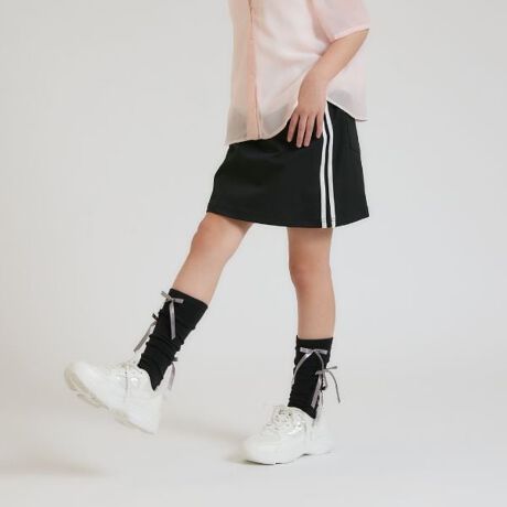 2本のサイドラインがスポーティーで可愛いスカートです。ウエストは取り替え口つきの総ゴム仕様で、お着替えも簡単。前のボタンはフェイクです。両側にポケットも備えています。