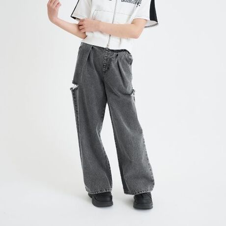 ブルーグレーとミディアムグレーの太もも部分にほどこした、ダメージ加工がクールすぎないおしゃれなポイント。