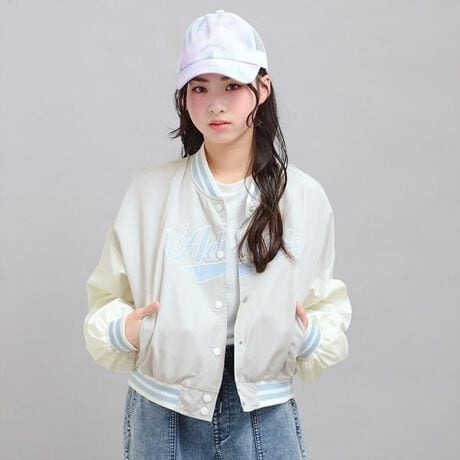 スタジャンはスポーティなアイテムですが、スカートなどガーリーなスタイリングに合わせるのがピンクラテ流!