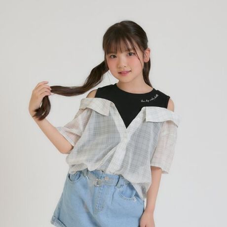 肩あきシアーチェックドッキングシャツ