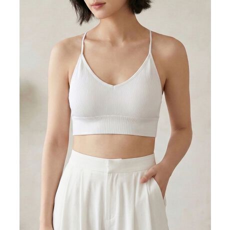 洋服とのスタイリングに1枚持っておくと重宝するバッククロスデザインのミディ丈ブラトップ。