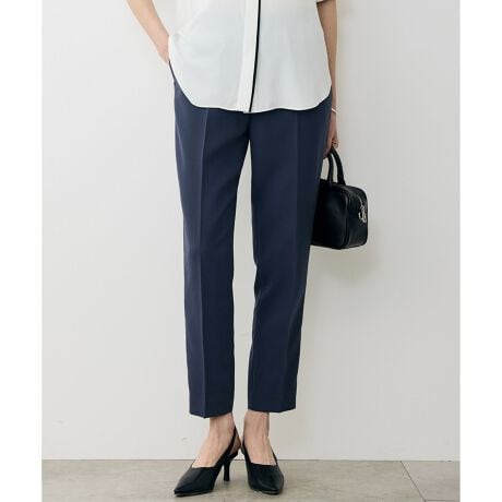 ■デザインウエスト内側にドロスト仕様を採用したセンタープレス入りのスティックパンツです。ウエストベルト部分は光沢感のある裏面使いでさり気ない洒落見えを叶えます。ウエストゴムでストレスフリーな穿き心地でなので、デスクワークも長時間の移動もラクラク。同シリーズのブラウスやロングジレと合わせてセットアップで、セレモニーシーンにも活躍します。
