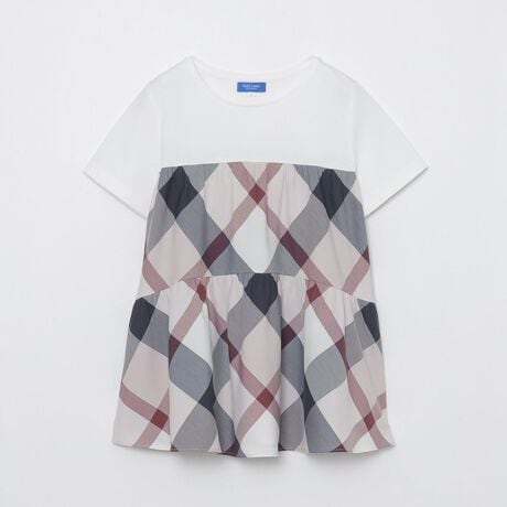 [型番:55P06728__]◆ティアードデザインが華やかなTシャツ【Design】無地×クレストブリッジチェックの異素材コンビTシャツです。胸元から裾にかけてティアードデザインでふんわり広がるシルエットは、身体に張りつかない軽やかな着心地。カジュアルにもきれいめにも対応できるデザイントップスです。