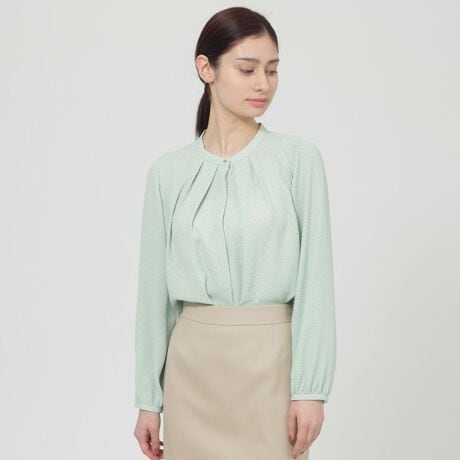 素材の落ち感を活かし、襟元にタックデザインを施したブラウスです。