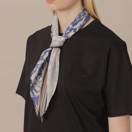 アイコンであるバイブリーフラワーのスクエアスカーフです。2種のタッチの柄をボーダーで引き締めたデザインになっております。透け感が美しく軽やかなウォッシャブルのシルクローンを使用。Tシャツの首元になど暑い時期にも身に着けやすくなっています。バッグ、帽子やヘアリボンとして結んでも。繊細な柄を熟練した職人が丁寧に手捺染し仕上げたMADE IN JAPANのスカーフです。