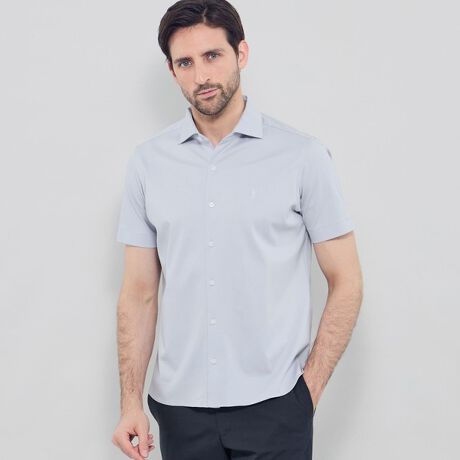 ワイドカラーの前開きカットシャツです。ボディは定番のドレスシャツをベースに身体に程よくフィットするシルエットにしていますが生地にハリがあるので、身体のラインを拾い過ぎず着用時のシルエットがキレイです。ディティールもドレスディテールを意識し、裾はガゼット付きシャツテール、背ヨーク巾は狭めに設定し、エレガントな雰囲気を持たせました。左胸に同色でダンディマン刺繍が入ります。脇下にデオドラントテープを施すことで、消臭効果も付与しています。