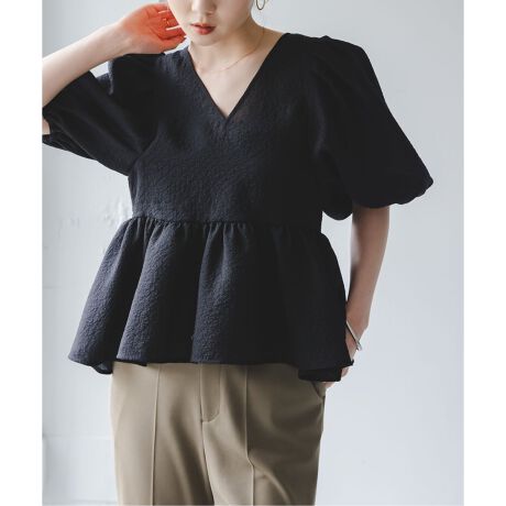 一見、可愛くなりすぎるペプラムもたっぷりとしたボリューム感を設けることで適度なスパイスさが生まれ、深めのVネックも相まって大人の格好良さも伝わるデザインです。