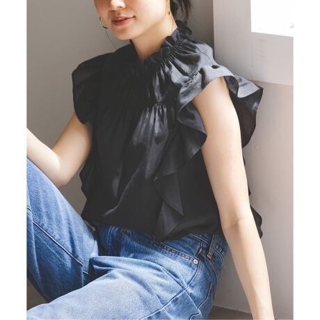 身頃に施したフリルは着映えを叶えつつ、腕のフリルは二の腕がすっきり見えるように計算されているため、一枚でも安心してお召しいただけます。