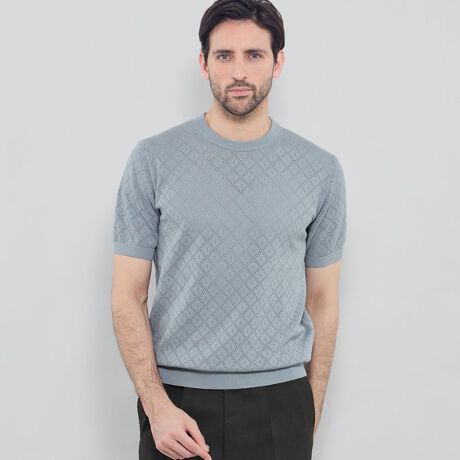 ソフトな風合いで毛羽が少なく、自然な光沢感が特徴のインド超長綿を、コンパクトスピニングで紡績した糸を使用しています。英語で「小さい穴」という意味のアイレット(透かし編み)技法を用いたダイヤ柄の編地です。一般的なレースと異なり、3本の糸を引き揃えて編み立てているため、適度な膨らみのある程よい肉感に仕上がっています。風通しが良いため着用期間が長く、夏の暑い時期でも快適にご着用いただけます。
