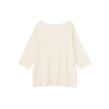 一枚で決まる上品な表面感トップス立体感のある表面素材が魅力の5分袖カットプルオーバーです。さりげない凹凸がシンプルな中にも表情を生み、無地でも着映えする一枚に仕上がっています。ほどよいゆとりのあるシルエットで体のラインを拾いにくく、リラックスしながらきれい見えを叶えます。5分袖デザインは気になる腕まわりを自然にカバーし、季節の変わり目にも活躍します。パンツにもスカートにも合わせやすく、通勤やお出かけなどオンオフ問わず着回しが可能です。上品カジュアルなスタイルを楽しめる、大人のデイリートップスです。※エクリュのみ、やや透け感あり。透け感[なし]