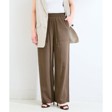 サテンほどとろみがなく程よいハリ感のあるセルロース系、微光沢なカルゼ目の涼しげな素材を使用しています。ワッシャー加工によるナチュラルなシワ感がこなれた印象で肌離れもよく、クセのないセミワイドストレートシルエットになります。