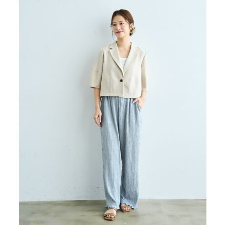 縦に流れるような凹凸感のある楊柳素材が、シンプルなスタイリングの中にさりげない奥行きを演出します。