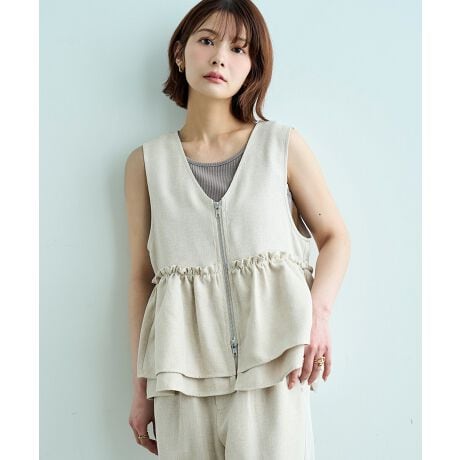リネンのようなさらりとした質感が心地よい、夏の装いに映えるペプラムジレ。