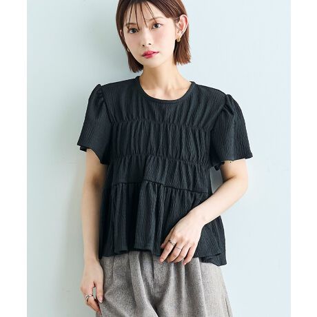 【イージーケア】カット楊柳 シャーリングペプラムブラウス 【mil (ミル)】