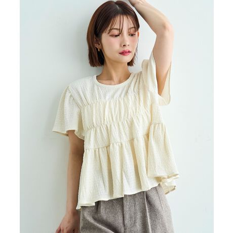 【イージーケア】カット楊柳 シャーリングペプラムブラウス 【mil (ミル)】