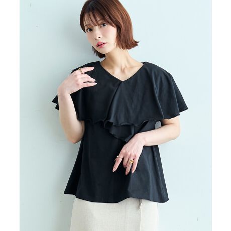 Tシャツ感覚で着られる気軽さがありながら、まるでケープのように広がるラッフルカラーが、
