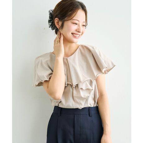 Tシャツ感覚で着られる気軽さがありながら、まるでケープのように広がるラッフルカラーが、