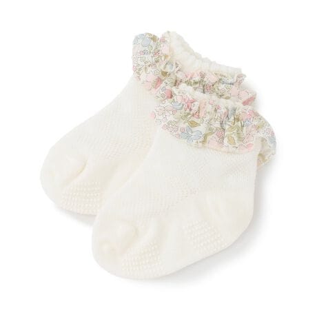 リバティファブリックスの花柄をフリルに取り入れたソックスです。足首や甲の部分はメッシュ編みになっており、通気性が良く快適なはき心地。すべり止めプリントつきで歩きやすいのも魅力です。上品な雰囲気なので、おめかししたい特別な日の装いにマッチします。
