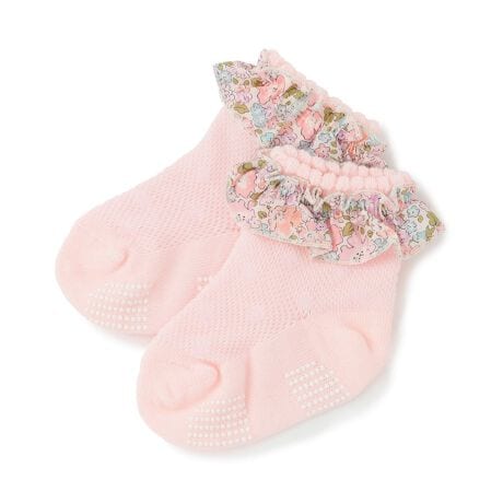 リバティファブリックスの花柄をフリルに取り入れたソックスです。足首や甲の部分はメッシュ編みになっており、通気性が良く快適なはき心地。すべり止めプリントつきで歩きやすいのも魅力です。上品な雰囲気なので、おめかししたい特別な日の装いにマッチします。