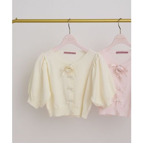 ローズモチーフとサテンリボンがガーリーな半袖のカーディガン。
