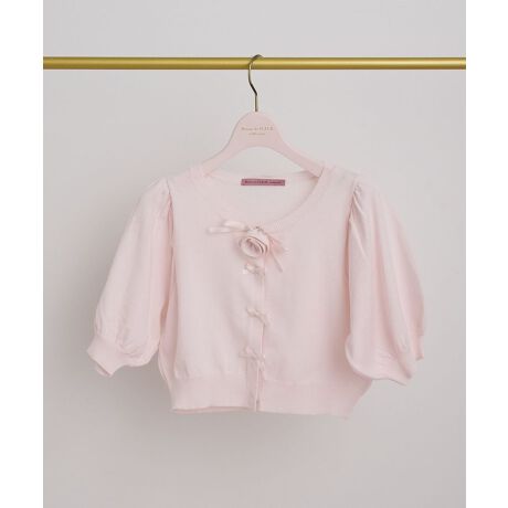 ローズモチーフとサテンリボンがガーリーな半袖のカーディガン。