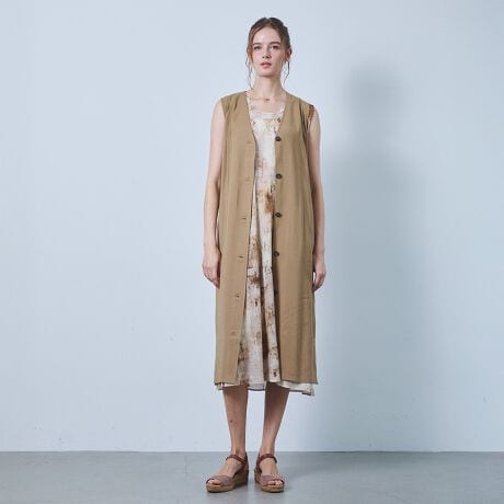 [型番:761206]麻混のスラブ感とドライな肌触りの生地です。ジレとしてもジャンスカとしても着られるデザインとなっています。同素材のスカートと合わせてセットアップで着用可能です。インナーにブラウスやカットソーで合わせて◎※同シリーズ品番:761506 麻混ラップスカート※商品画像は光の当たり具合などにより実際の色味と異なって見える場合があります。エトレリー etre relie