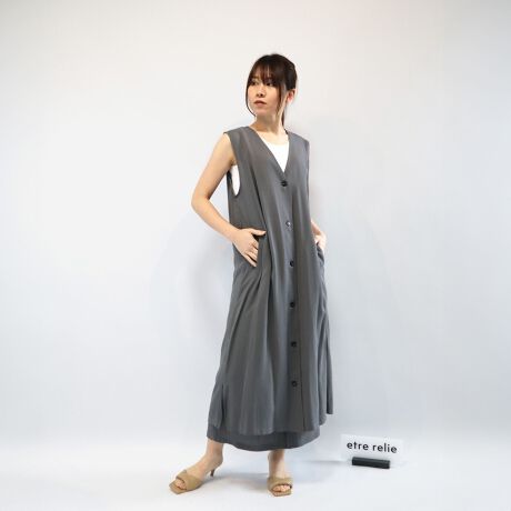 [型番:761206]麻混のスラブ感とドライな肌触りの生地です。ジレとしてもジャンスカとしても着られるデザインとなっています。同素材のスカートと合わせてセットアップで着用可能です。インナーにブラウスやカットソーで合わせて◎※同シリーズ品番:761506 麻混ラップスカート※商品画像は光の当たり具合などにより実際の色味と異なって見える場合があります。エトレリー etre relie
