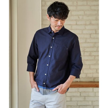 裾に切り替えデザインを施した7分袖シャツ。