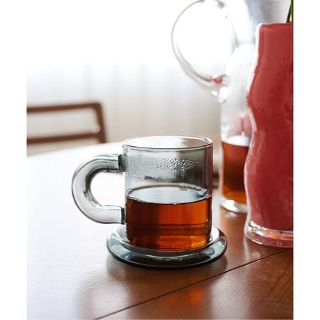 透明感のあるボディに、持ちやすく柔らかな曲線のハンドルと同色のソーサーを組み合わせ、日常の食卓を上品に彩ります。