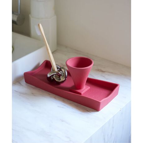 ディスペンサーやうがい用コップ、歯ブラシなどをすっきり収められるセラミック製トレー。