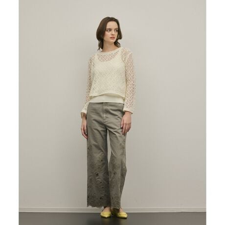 コーディネートが華やかに決まる、春夏スタイルにぴったりな大人のフレアパンツ。カットワークの柄を活かしたスカラップ仕様の美しいデザインが抜け感と女性らしさをプラスし、装いを優雅に印象付けます。加工により色落ちする染料を使用したコットンツイル素材を使用。さりげなくフレアになった美脚シルエットもポイントです。装いが爽やかに決まるホワイトと、デイリーカジュアルに馴染むカーキの2色をご用意しました。