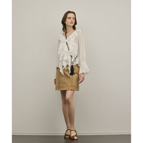 [型番:0126221101]生地硫化染めのカツラギ素材にハマグリ刺繍をパッチワーク状に施したミニスカート。パーツとパーツの間をハシゴ状に刺繍しレースのような透け感を出した意匠性の高いデザイン。※こちらのモデル着用画像はサンプル品を撮影しております。実際の商品と仕様、加工、サイズが若干異なる場合がございます。予めご了承くださいませ。