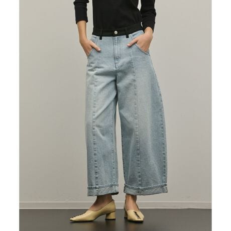 トレンド感溢れる装いへと導いてくれる旬顔バレルパンツ。程よい厚みと柔らかさを兼ね備えた、11オンスの加工映えするデニムを使用。ややすっきりとした腰周りから膝周りにかけて程よくボリュームを出した構築的なバレルシルエットが、カジュアルな中に女性らしさを感じさせる美しいラインに仕上がっています。ウエストにはスーツ地を使用して個性をき効かせ、他にはない新鮮なコンビデザインに仕上げました。ウエストインした時にもおしゃれに決まり、ワンランク上の装いへと導いてくれます。今季の新定番パンツになること間違いなしの主役級の一本です。