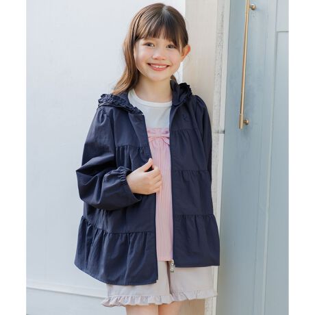 フードまわりに施したフリルやお花型のファスナー引手が可愛らしいポイントです。