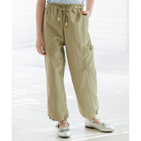 ウエストトゴム仕様で着脱も楽ちんです。両サイドのアウトポケットには共布のリボンをあしらいカジュアルな中にもかわいらしさのあるデザインになっております。