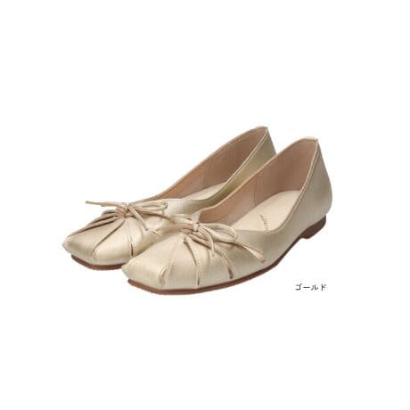 すっきりとしたスクエアトゥに、立体感のあるリボンをあしらった上品なフラットシューズ。