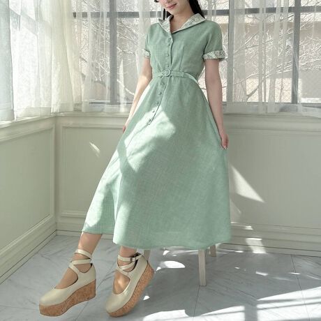 衿とカフスのレース使いがヴィンテージライクな印象漂うワンピース。