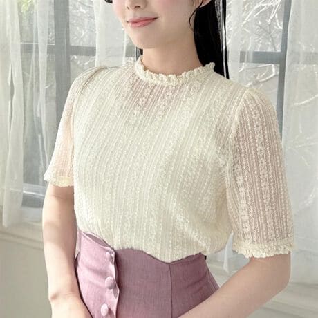 フラワーモチーフのストライプレースを使用したガーリーなトップス。