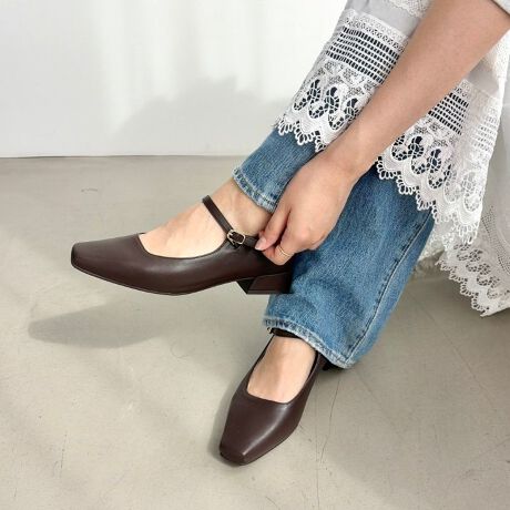 シンプルなスクエアトゥでオンオフ兼用に使えるストラップパンプス。