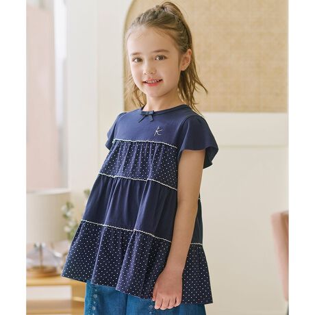 ■デザインドット柄を交互にティアード使いにしたチュニックです。裾に広がりがあるティアードシルエットでゆったり着用いただけます。