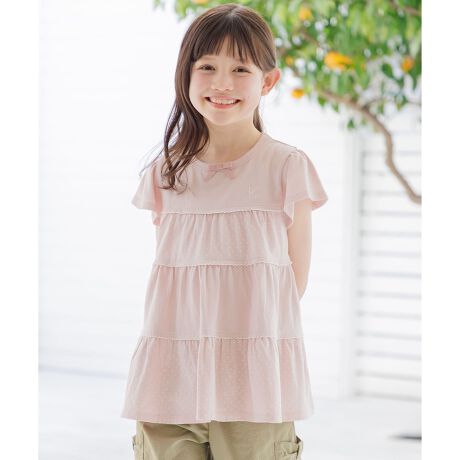 ■デザインドット柄を交互にティアード使いにしたチュニックです。裾に広がりがあるティアードシルエットでゆったり着用いただけます。