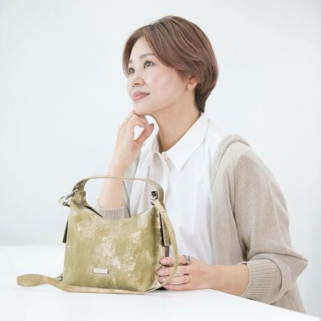 バッグ本体と同じ素材で仕立てた5段階に調整可能なショルダーベルトが付いているので、ハンドバッグとしてもショルダーバッグとしても使用可能です。
