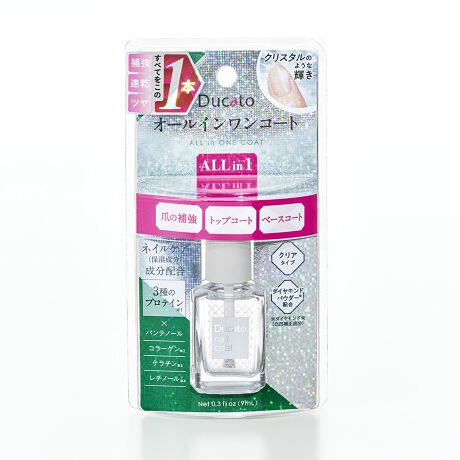 すべてをこの1本に。爪の補強・トップコート・ベースコート。ツヤ出し、速乾処方。ネイルケア(保湿成分)配合。3種のプロテイン※1、パンテノール、加水分解コラーゲン、加水分解ケラチン、パルミチン酸レチノール。クリアタイプ。ダイヤモンドパウダー※ダイヤモンド末(凹凸補正成分)配合